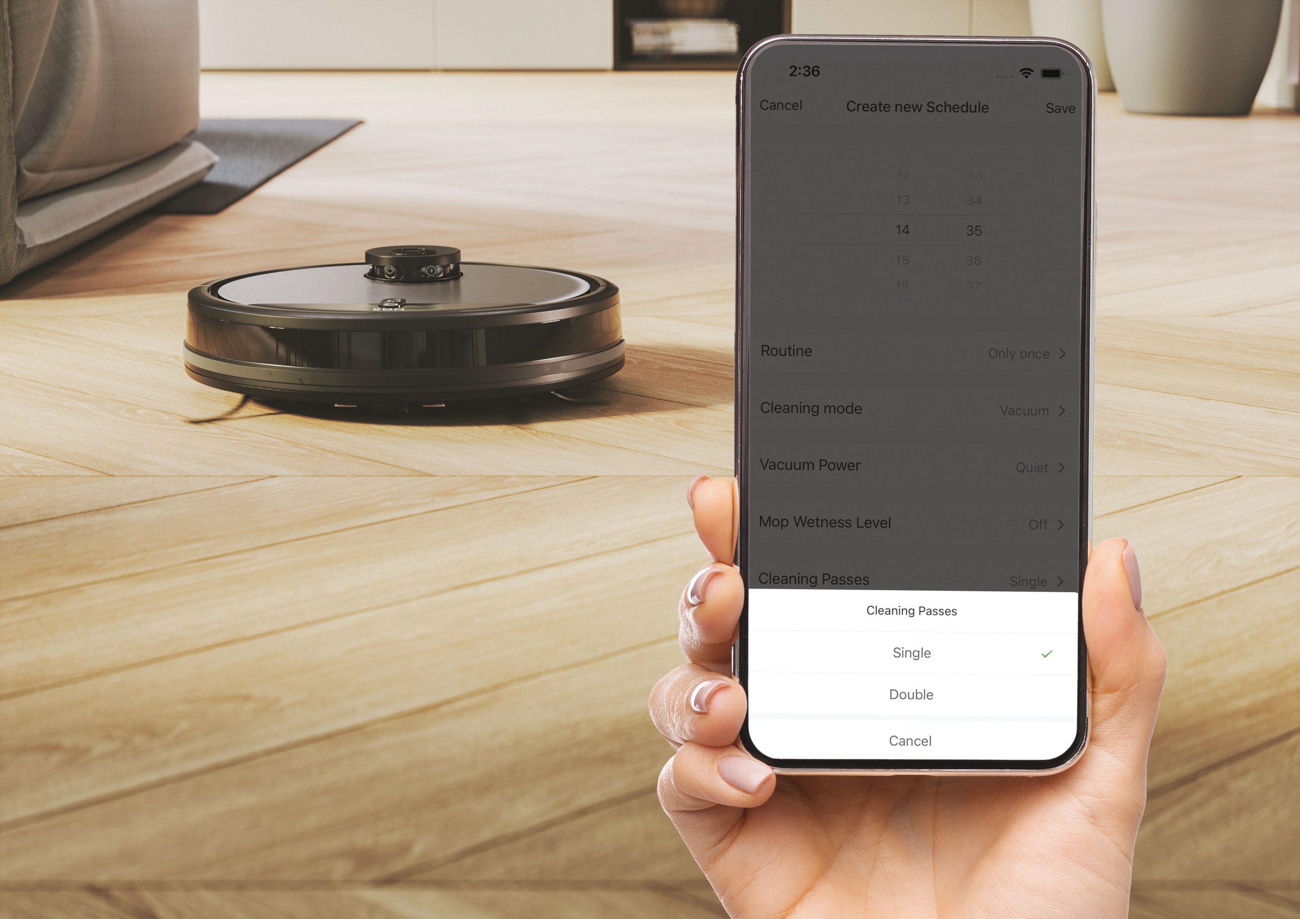 Dzięki baterii litowo-jonowej zapewnia do 90 minut pracy na jednym ładowaniu, a po jego zakończeniu automatycznie wraca do stacji ładującej. Pojemność zbiornika na kurz wynosi 0,5 litra. Model stosuje filtrację EPA oraz posiada czujniki zabezpieczające przed upadkiem z krawędzi schodów, wykrywające przeszkody i zapobiegające kolizjom.
