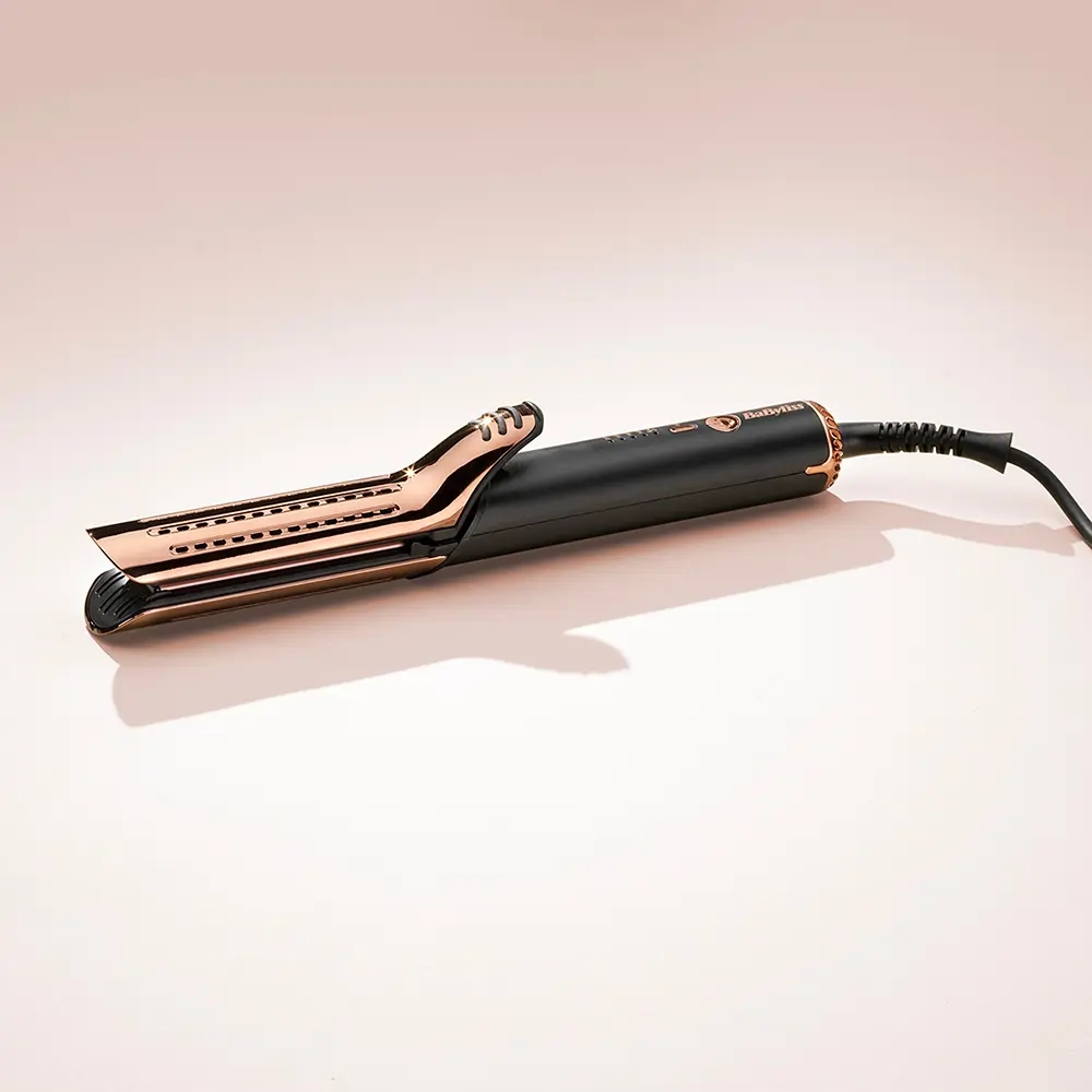 Odkryj możliwości połączenia efektów ciepła i powietrza. Podgrzewane płytki ceramiczne wygładzają włosy, a 38-milimetrowa lufa z tytanu uwalnia chłodne powietrze, które utrwala stylizację. Wystarczy umieścić pasmo między płytkami, zakręcić włosy dookoła wałka i przesunąć urządzenie od nasady aż po końce, co pozwala na szybkie i efektywne modelowanie włosów.